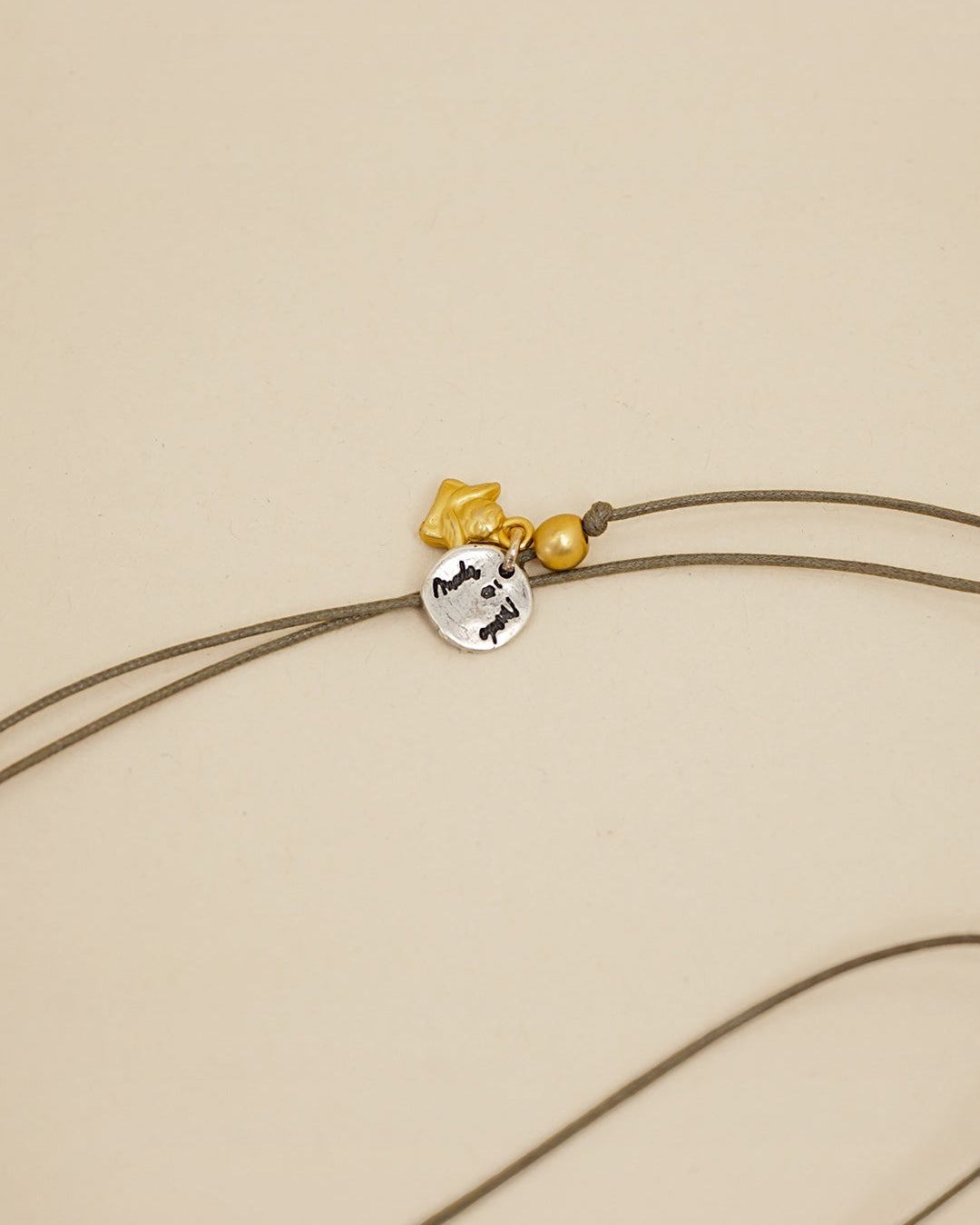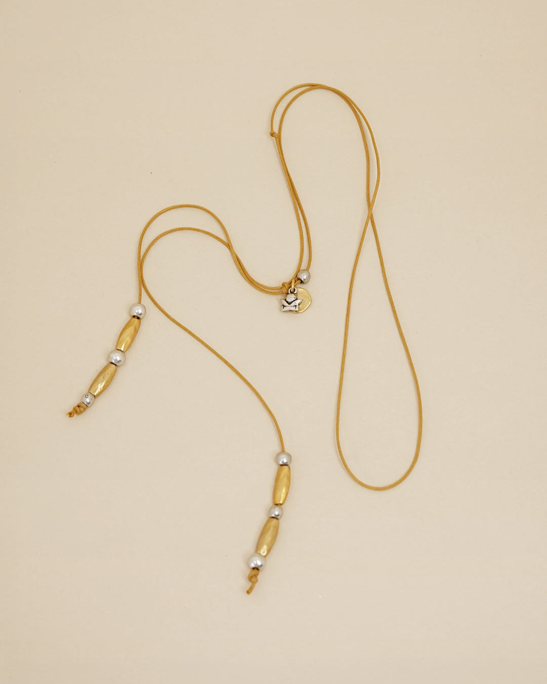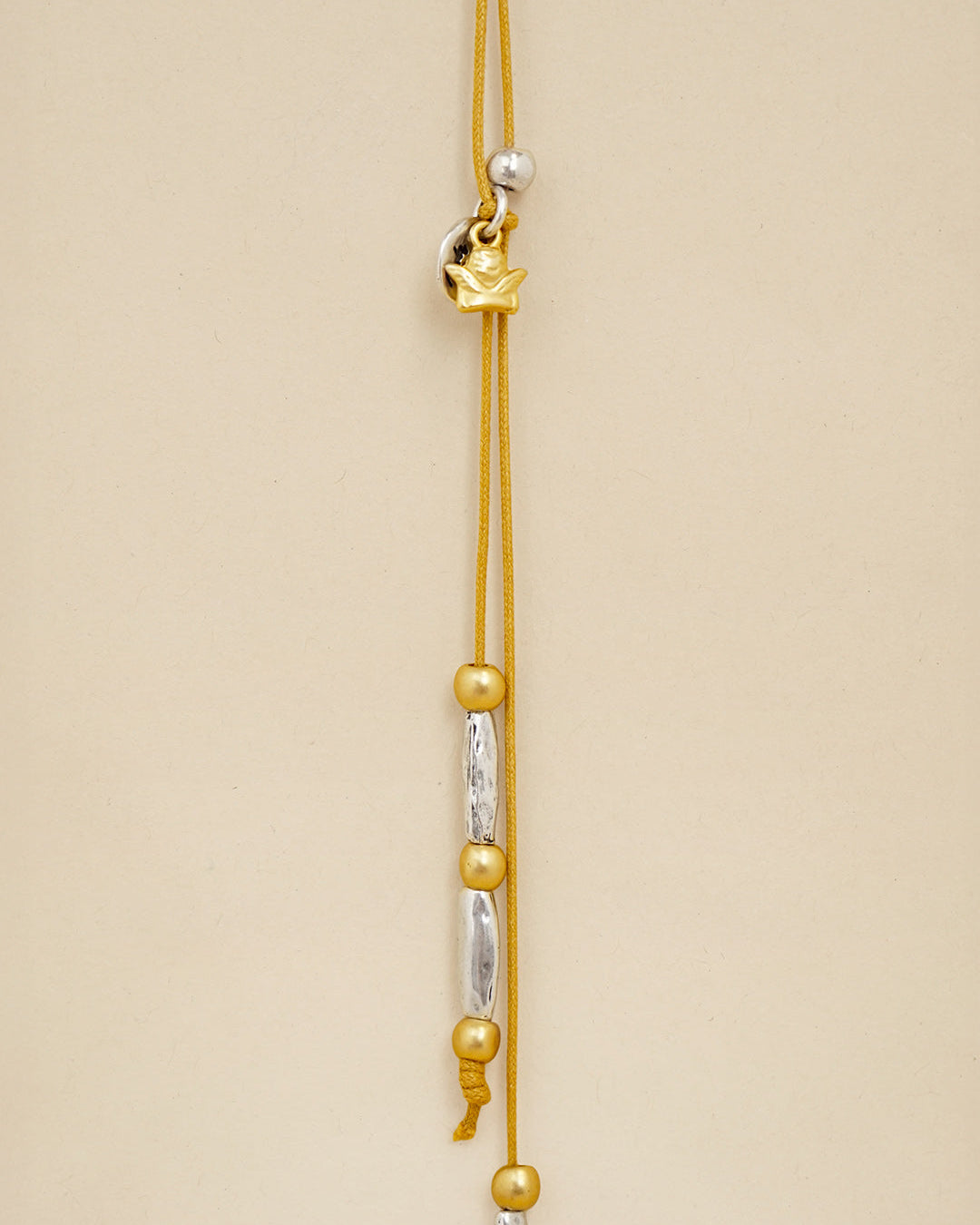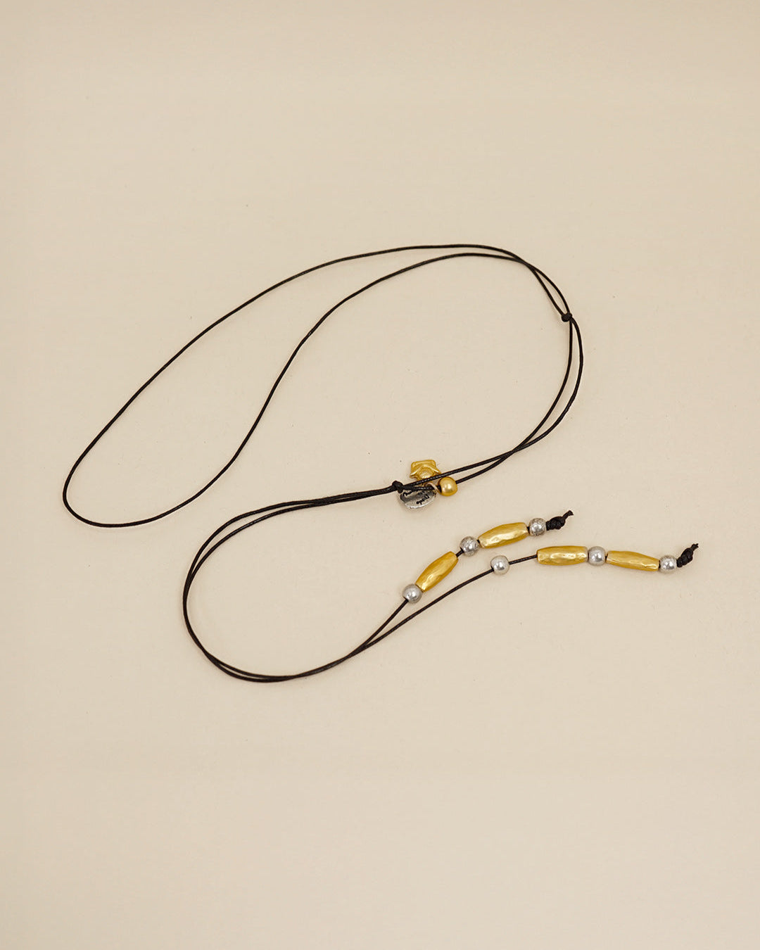 Gaby è una collana che gioca con i contrasti: oro tenue, argento grezzo e la chiarezza dello spazio intermedio.