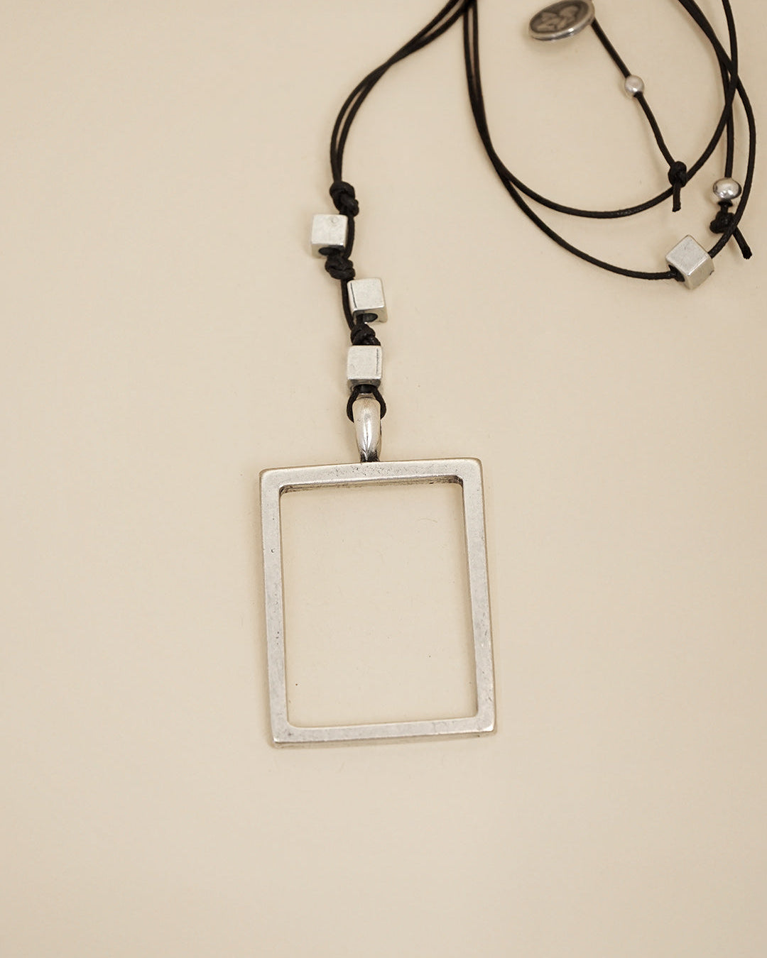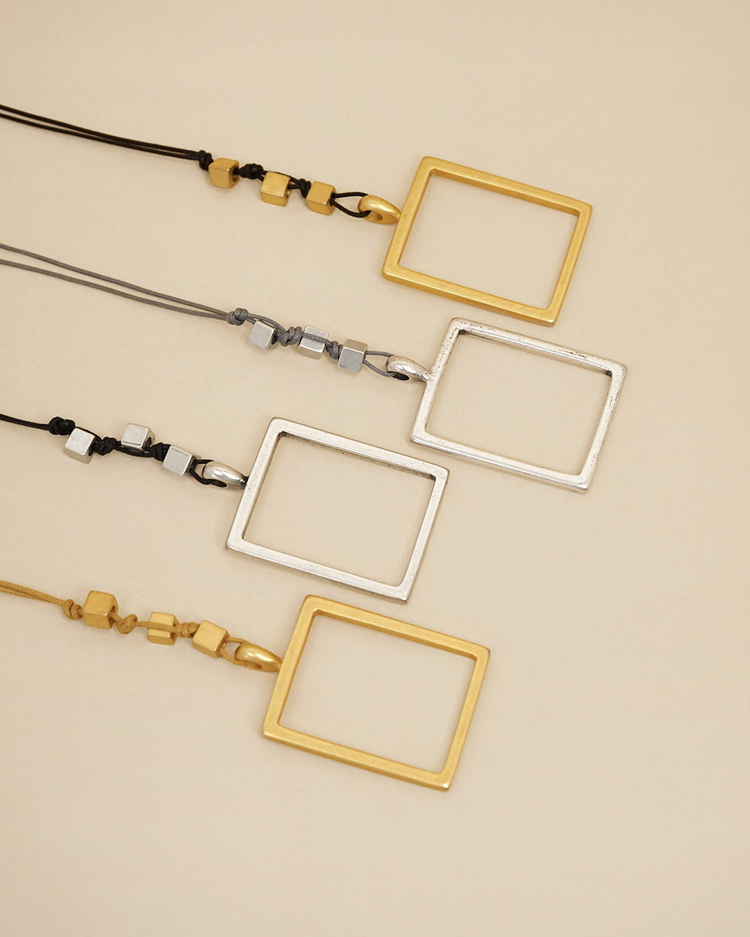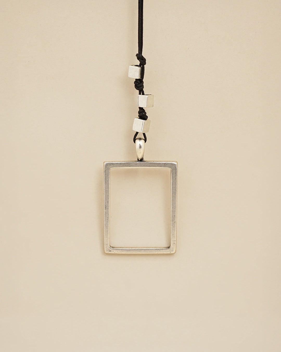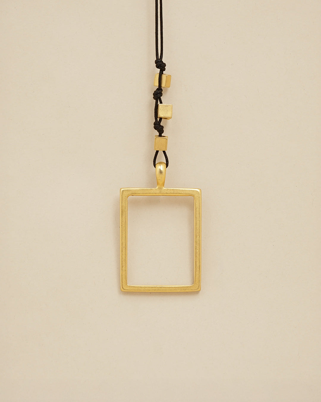 Questa collana geometrica attira lo sguardo verso l'interno: un invito silenzioso a guardare, riflettere e trattenere lo spazio .