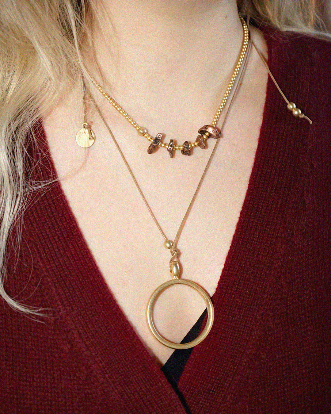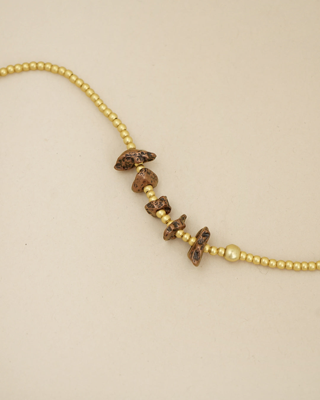 The Vega necklace is composed of metallic beads and irregular, nature-inspired shapes — each one unique, each one carrying the memory of the earth.
