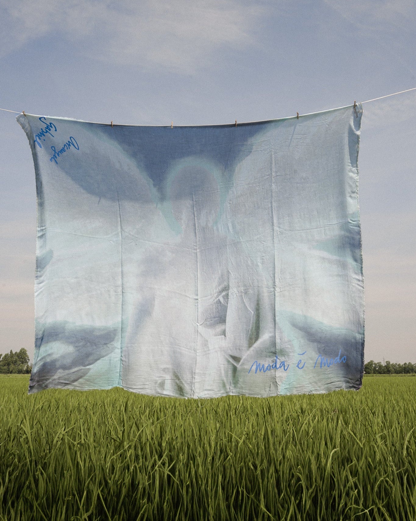 The Arcangelo Gabriel shawl carries the symbolism of guidance, clarity, and divine communication. Its serene blue tones and angelic presence invite calm and trust, making it a meaningful companion through all seasons of life. Light, soft, and versatile, it can be worn in many ways – from everyday use to special moments of reflection.